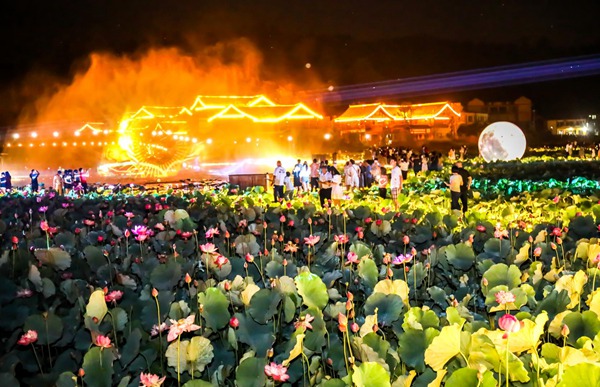 走進(jìn)山灣,一棟棟木欄青瓦的農(nóng)房錯(cuò)落有致,微風(fēng)輕拂,一片片荷葉迎風(fēng)起舞,各色荷花爭芳吐艷,池塘里霧氣升騰,加上別致的鄉(xiāng)村風(fēng)貌和獨(dú)特的燈飾布景,游人穿行其間,猶如游歷仙境一般。