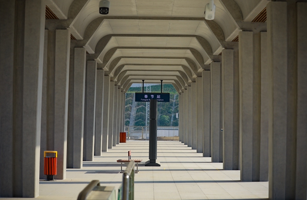 云陽站位于云陽縣黃石鎮(zhèn),站場規(guī)模為2臺4線,線側(cè)下式布局。其外觀整體設(shè)計吸取了當?shù)刂坝^登云梯和“以耕養(yǎng)讀,勤耕立家”的耕讀文化傳統(tǒng),以流暢層疊的線條,闡述了“耕讀云水間,梯城展新顏”的主題,并將張飛廟窗格元素融入候車大廳吊頂方案之中,利用窗格進行分隔,形似階梯步步高升,以此象征著云陽人民勇攀高峰的城市精神。