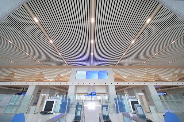 巫山站地處巫山縣桂花村,該站采用線正下式布局。該站房建筑外觀形態(tài)以“巫”為寓意,結(jié)合當?shù)氐赜蚪ㄖ臉?gòu)建形式,以形體和材質(zhì)的組合,展現(xiàn)出巫山的云頂山城景象。其候車大廳主題墻運用層疊的裝飾手法與線形光源相結(jié)合,輔以格柵造型,以更加立體的方式來呈現(xiàn)巫山“云繞奇峰、霧鎖平湖”的夢幻景象。