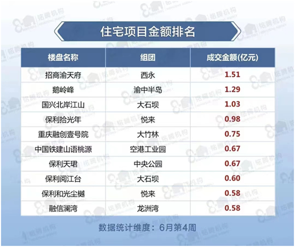 招商·渝天府領(lǐng)跑重慶6月第四周住宅成交金額市場