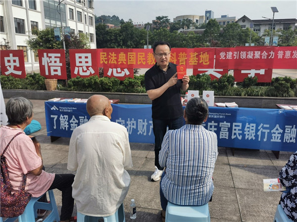 由重慶富民銀行股份有限公司、重慶坤源衡泰律師事務(wù)所、民法典國民教育科普基地、重慶兩江新區(qū)藍天救援隊、大灣鎮(zhèn)龍洞巖村黨支部聯(lián)合組織的“黨建引領(lǐng)凝聚合力·普惠發(fā)展富惠民生”黨支部聯(lián)學(xué)共建活動在渝北大灣鎮(zhèn)舉行,通過現(xiàn)場開展金融知識、法律知識、急救知識等講座,發(fā)放金融消費者權(quán)益保護、征信、反洗錢、民法典普法讀物等宣傳資料,不斷提升農(nóng)村地區(qū)居民金融知識和金融技能,以及增強其法律風(fēng)險防范意識和安全意識。