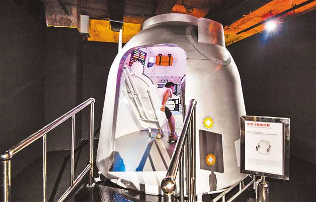 六月二十九日,《漫無邊界》展覽現(xiàn)場,一位參觀者正在體驗神舟飛船返回艙模型。記者 齊嵐森 攝\視覺重慶