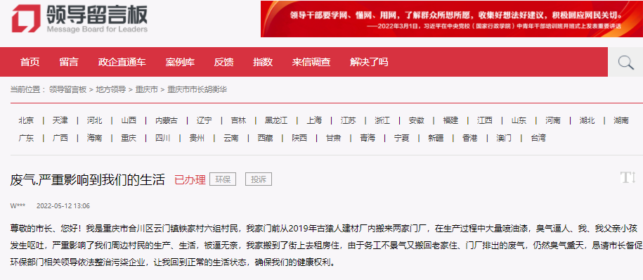 網(wǎng)友在留言中表示,其是合川區(qū)云門鎮(zhèn)鐵家村六組村民。“我家門前2019年從古猿人建材廠內(nèi)搬來兩家門廠,在生產(chǎn)過程中大量噴油漆,臭氣逼人。嚴(yán)重影響了我們周邊村民的生產(chǎn)、生活。”該網(wǎng)友稱,因異味擾民,一家人搬到了街上去租房住了一段時(shí)間,搬回老家后,發(fā)現(xiàn)門廠排出的廢氣,仍然臭氣熏天。“懇請市長督促環(huán)保部門依法整治污染企業(yè),讓我回到正常的生活狀態(tài),確保我們的健康權(quán)利。”