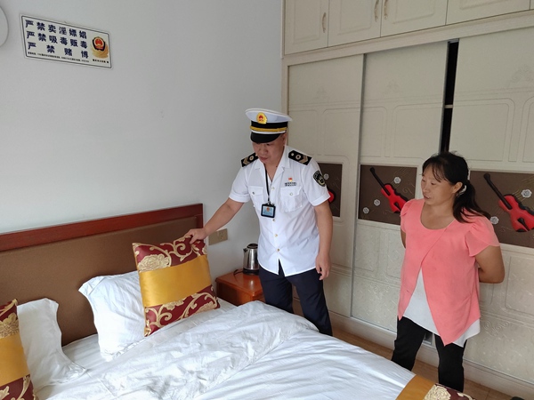 衛(wèi)生監(jiān)督員檢查客房衛(wèi)生。江津區(qū)衛(wèi)生健康綜合行政執(zhí)法支隊(duì)供圖