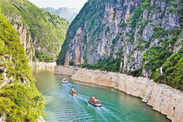 7月24日,游船載著游客暢游在國(guó)家AAAAA級(jí)景區(qū)巫山龍門峽中。