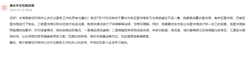 收到留言后,重慶市文化旅游委高度重視,立即責(zé)成重慶圖書(shū)館、南岸區(qū)圖書(shū)館、巴南區(qū)圖書(shū)館進(jìn)行了核實(shí)。三家圖書(shū)館分別與網(wǎng)友進(jìn)行了電話溝通,就相關(guān)情況進(jìn)行了詳細(xì)解釋說(shuō)明。