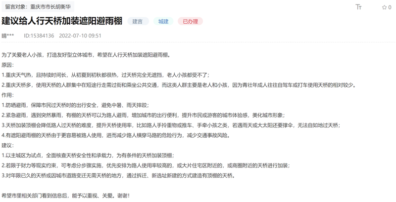 人民建議|人行天橋能否加裝遮陽(yáng)棚?重慶市住建委積極回應(yīng)