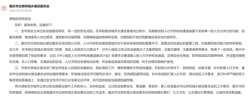 收到留言后,重慶市住房與城鄉(xiāng)建設(shè)委員會(huì)就相關(guān)情況進(jìn)行了詳細(xì)回復(fù):全市各區(qū)立體過(guò)街設(shè)施建設(shè)現(xiàn)狀,有一定的歷史成因。先期建設(shè)的人行天橋和地通道偏重于實(shí)現(xiàn)單一的人行立體過(guò)街功能,忽略了無(wú)障礙、美感度等人性化方面的需求,通常都未加裝雨棚、無(wú)障礙坡道或電梯等設(shè)施。