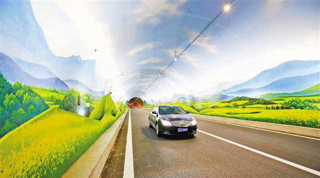 7月30日,城開(kāi)高速城口縣雞鳴鄉(xiāng)至開(kāi)州區(qū)譚家鎮(zhèn)段正式開(kāi)通。圖為車(chē)輛從城開(kāi)隧道3D裸眼彩繪段駛過(guò)。記者 羅斌 攝/視覺(jué)重慶