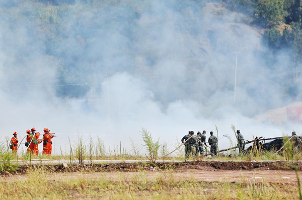 演練模擬強(qiáng)降雨天氣來臨,導(dǎo)致漢豐湖水位暴漲,景區(qū)人員落水;長沙鎮(zhèn)胡橋村后一山體出現(xiàn)滑坡,2棟民房被巨石砸中;一輛運(yùn)輸壓縮天然氣的罐車為躲避滾落的大石,罐體破損發(fā)生泄漏;在各地救援工作緊張進(jìn)行時,119接警,紫建電子和長沙鎮(zhèn)林場突發(fā)火情,火勢較大,情況危急。