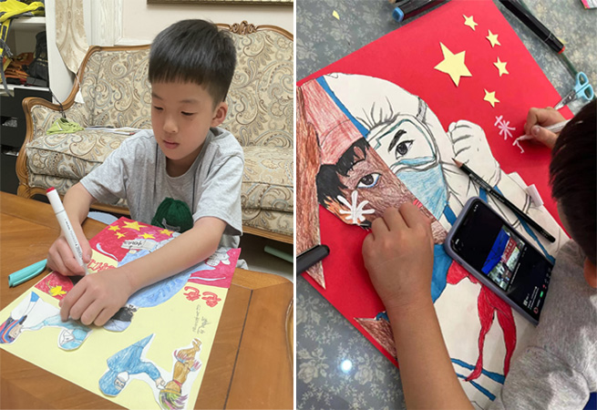 這是兩幅有中國(guó)地圖、有五星紅旗、有爸爸和援外隊(duì)員身影的畫,色彩豐富,透露著兒子思念爸爸、欽佩爸爸的童心……