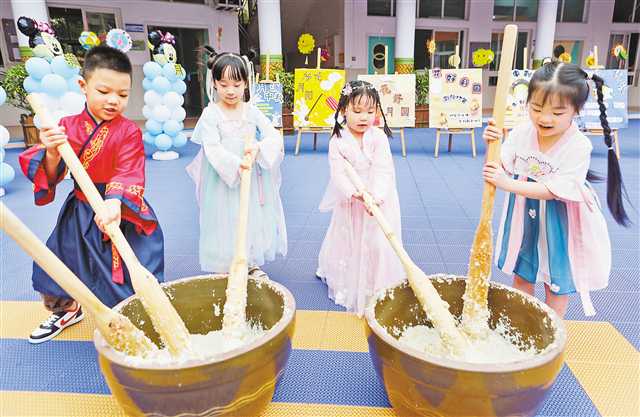 9月8日,大足區(qū)東城幼兒園,小朋友正在體驗(yàn)打糍粑。當(dāng)日,該園舉行“我們的節(jié)日·中秋”主題活動(dòng),小朋友們通過(guò)打糍粑、著漢服、繪制花燈等方式,感受傳統(tǒng)民俗文化,喜迎中秋佳節(jié)。特約攝影 瞿波/視覺(jué)重慶