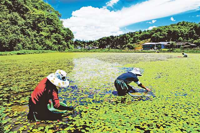 村民在采摘莼菜。(石柱縣委宣傳部供圖)