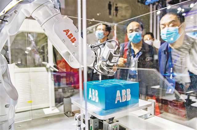 重慶國際博覽中心舉辦的2021全球半導(dǎo)體產(chǎn)業(yè)(重慶)博覽會上,ABB中國帶來的一款機器人正在展示其自動標定功能。記者 張錦輝 攝/視覺重慶