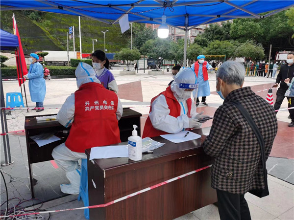 在開(kāi)州,分公司組織黨員先鋒隊(duì)20人下沉到明鏡石社區(qū)參與疫情防控工作,配合社區(qū)累計(jì)完成超700戶2000余人核酸檢測(cè)工作。