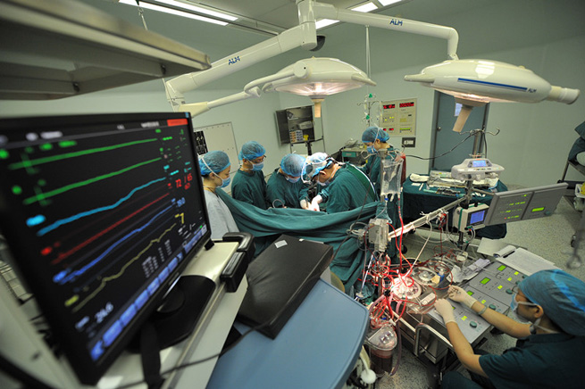 在綠色通道完善各項檢查的同時,心血管外科肖穎彬教授率團隊在手術室進行急診準備。手術臺上,當專家們打開心包腔,看見主動脈夾層已經破裂 心包腔內有大量積血,幸好及時手術。專家們小心翼翼置換主動脈瓣、升主動脈及主動脈弓,并在降主動脈置入支架,經過長達近8個小時的搶救,患者于順利返回監(jiān)護室。