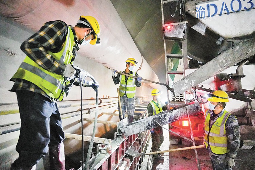 12月11日,萬州長江二橋北橋頭至高鐵片區(qū)連接道工程現(xiàn)場(chǎng),工人在隧道內(nèi)施工。