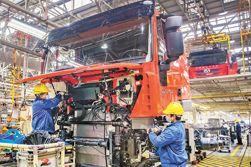 12月16日,上汽紅巖汽車有限公司,工人正在總裝車間作業(yè)。