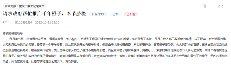 又到一年橙香時。楊守江看著自己辛苦種植的臍橙迎來豐收,心里卻喜憂參半,他為掛滿枝頭的一顆顆甜蜜臍橙的銷售發(fā)起了愁。同時,他也希望擴大銷路讓更多海外朋友能品嘗到家鄉(xiāng)的臍橙。2022年12月12日,楊守江通過“領導留言板”給新任重慶市委書記袁家軍留言建議:請求政府幫忙推廣宣傳,讓更多的海外朋友嘗到我們地道的奉節(jié)臍橙,讓奉節(jié)臍橙真正名滿天下!