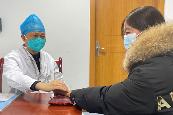 秦小平在門診為患者把脈。合川區(qū)中醫(yī)院供圖