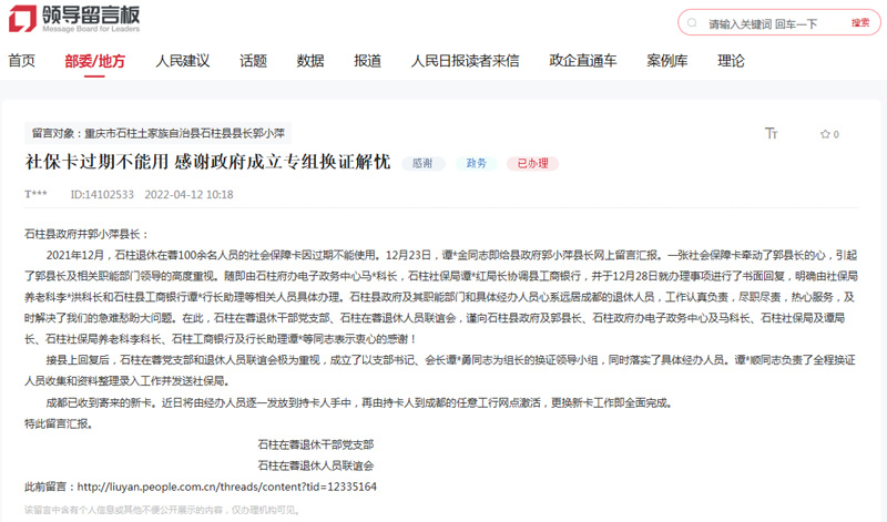 想群眾之所想,急群眾之所急,解群眾之所難。2022年初,百余位退休老人通過人民網(wǎng)“領導留言板”反映,他們從重慶市石柱土家族自治縣退休后,一直隨子女生活居住在成都。因為社??ㄟ^期不能使用,如果都返回石柱辦理社保卡,對老人而言尤其不方便,想咨詢可否銜接成渝雙城通辦解決?