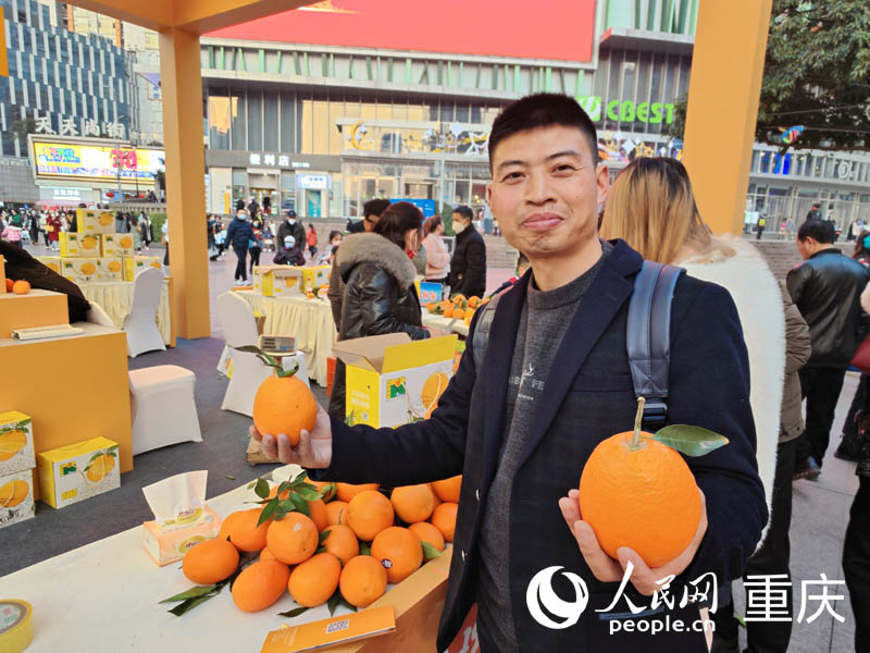 1月6日,楊守江在“橙博會”現(xiàn)場,宣傳奉節(jié)臍橙。人民網(wǎng) 陳琦攝