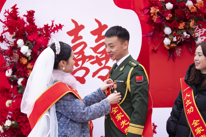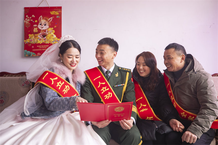 人民網(wǎng)重慶1月20日電 (陳琦、劉祎)1月17日,重慶市開州區(qū)一個(gè)農(nóng)家小院喜氣洋洋。一對(duì)年輕夫妻在農(nóng)家小院舉行婚禮的時(shí)候,收到武警重慶總隊(duì)執(zhí)勤第三支隊(duì)聯(lián)合當(dāng)?shù)赝艘圮娙耸聞?wù)局為新郎唐煒?biāo)腿サ奶厥庑禄椤百R禮”——三等功喜報(bào)。