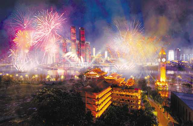 1月22日,焰火綻放在兩江交匯處,將市民和游客帶入新年的喜悅中。陳泓浩 攝/視覺重慶