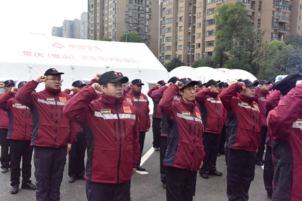 重慶(璧山)緊急醫(yī)學(xué)救援隊(duì)全體隊(duì)員宣誓。璧山區(qū)衛(wèi)生健康委供圖