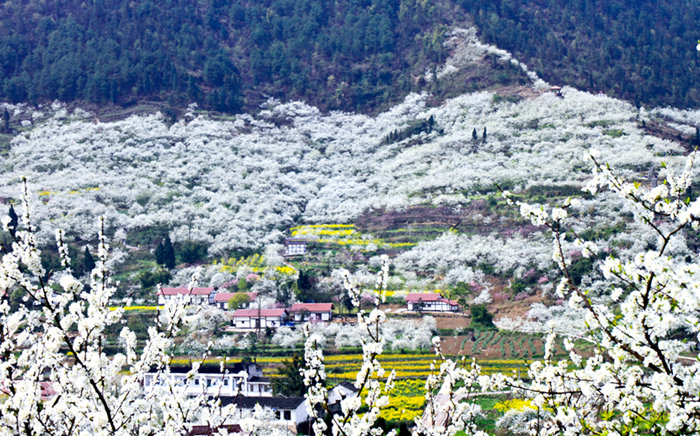 ?印盒李花生態(tài)旅游區(qū)位于渝北區(qū)統(tǒng)景鎮(zhèn)北部,是國家AAA級景區(qū),內(nèi)有50多年的李樹種植歷史,栽種面積上萬畝,每年三月,李花次第綻放,遠(yuǎn)望如皚皚白雪,近看似凝霜冰花,大有“半山李花滿山雪”之意境。