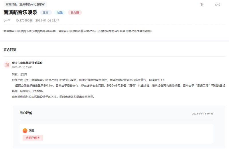 “前段時(shí)間聽到兩江幸福廣場(chǎng)噴泉升級(jí)改造的消息,請(qǐng)問這個(gè)消息是真的嗎?什么時(shí)候動(dòng)工?”群眾留言咨詢。【留言原文鏈接】