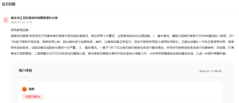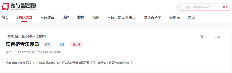 “觀音橋音樂噴泉于2011年完成升級(jí)改造,如今燈光和水型都出現(xiàn)嚴(yán)重?fù)p壞,請(qǐng)問是否有改造的意向?”群眾在領(lǐng)導(dǎo)留言板詢問。【留言原文鏈接】