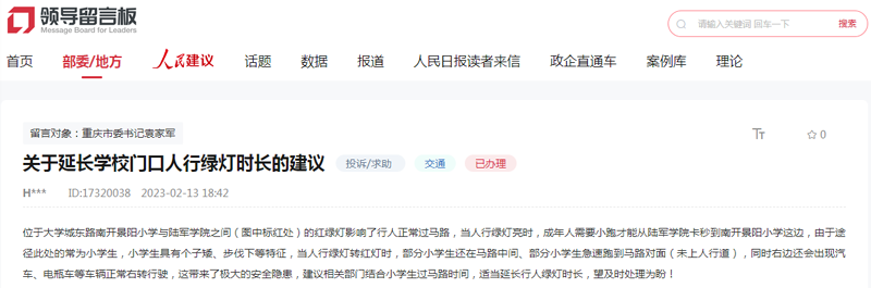 人民網(wǎng)重慶4月11日電 (陳琦)“建議結(jié)合小學(xué)生過馬路時(shí)間,適當(dāng)延長綠燈時(shí)長?!薄皩W(xué)校周邊車輛亂停亂放,給學(xué)生上下學(xué)造成交通安全隱患,盼整治?!苯?,有群眾通過人民網(wǎng)“領(lǐng)導(dǎo)留言板”反映校園周邊交通隱患問題,得到重慶相關(guān)部門的及時(shí)整改和治理。