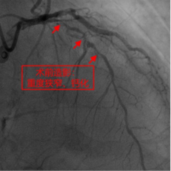 冉擘力主任介紹,患者為78歲男性,近年來常反復胸悶、氣短不適,合并心力衰竭、2型糖尿病、腎功能不全、貧血,多次因心力衰竭、肺部感染住院,不能正常生活。1月前患者曾行冠脈造影提示三支血管病變并對回旋支植入支架,但其中前降支嚴重鈣化伴重度狹窄,手術(shù)難度極大。冉擘力主任看到患者的造影結(jié)果后認為患者高齡、合并癥多、冠脈病變復雜,行外科冠脈搭橋風險較高,建議微創(chuàng)介入完成手術(shù),術(shù)前組織了全院多學科會診評估病情、討論圍術(shù)期治療方案。經(jīng)冠脈介入團隊崔坤副主任醫(yī)師、蒲云飛副主任醫(yī)師、王方超主治醫(yī)師多次討論,考慮冠脈彌漫性重度狹窄伴環(huán)形鈣化,決定采用Rota-Shock(旋磨+Shockwave)策略,處理冠脈彌漫且嚴重鈣化病變。