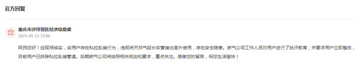 收到留言后,重慶市沙坪壩區(qū)經(jīng)濟(jì)信息委高度重視,立即進(jìn)行了現(xiàn)場(chǎng)核實(shí)。發(fā)現(xiàn)該用戶確實(shí)存在私拉亂接行為,違規(guī)將天然氣延長(zhǎng)軟管接出室外使用,存在安全隱患。燃?xì)夤竟ぷ魅藛T對(duì)用戶進(jìn)行了批評(píng)教育,并要求用戶立即整改,目前用戶已拆除私拉亂接管道。后期燃?xì)夤緦凑障嚓P(guān)規(guī)定和要求,重點(diǎn)關(guān)注。