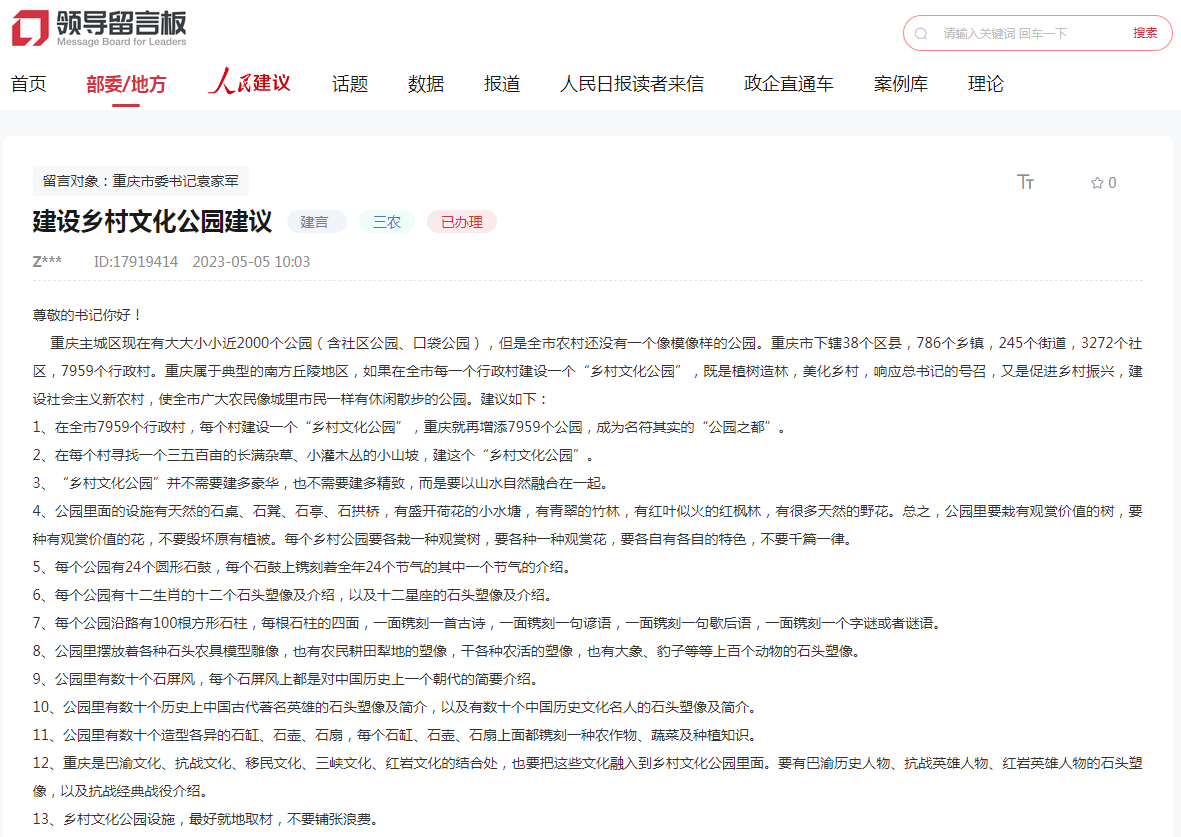 網(wǎng)民程先生在留言中提了13條詳細(xì)建議:重慶主城區(qū)現(xiàn)在有大大小小近2000個(gè)公園(含社區(qū)公園、口袋公園),但是全市農(nóng)村還沒有一個(gè)像模像樣的公園。重慶屬于典型的南方丘陵地區(qū),建議在全市7959個(gè)行政村,每個(gè)村建設(shè)一個(gè)“鄉(xiāng)村文化公園”,重慶就再增添7959個(gè)公園,成為名符其實(shí)的“公園之都”。