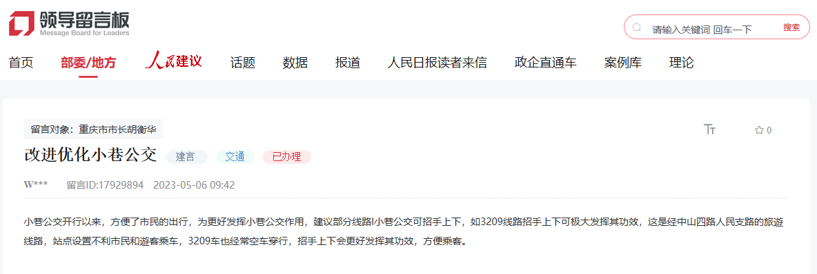 “建議部分線路的小巷公交可招手上下,如3209線路招手上下可極大發(fā)揮其功效,這是經渝中區(qū)中山四路人民支路的旅遊線路,站點設置不利市民和遊客乘車,招手上下會更好發(fā)揮其功效,方便乘客。”5月6日,該網友在留言中表示。