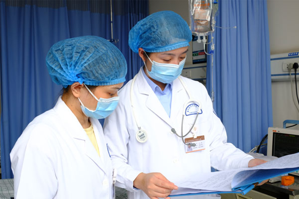 左新(右一)與同事查看患者病情。劉林杰攝