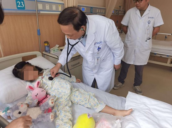 鐘前進(jìn)為即將出院的欣欣再次檢查心臟。重慶康心醫(yī)院供圖