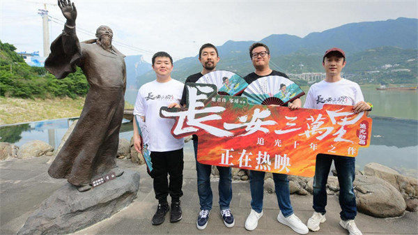 在夔州博物館內(nèi),面對李白的動畫,導(dǎo)演謝君偉和鄒靖表達了對于“輕舟已過萬重山”的感悟:“來到奉節(jié),深深感受到‘朝辭白帝彩云間’的詩景,也不免回想起與《長安三萬里》相伴的日子。電影上映三周了,從一個概念開始,看著影片一點點成型,仿佛已然走過了三萬里,跟隨電影度過了三萬里的人生,體驗了輕舟已過萬重山。我們所有的努力,能讓《長安三萬里》給大家留下美好的記憶。非常感激,感謝大家如此喜愛這部電影?!?/p>