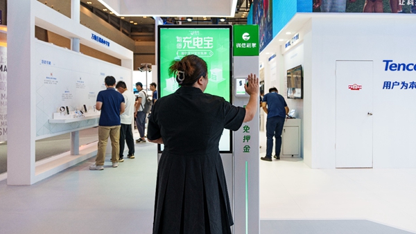2023智博會(huì)騰訊展區(qū)“微信刷掌”租借充電寶用戶體驗(yàn)現(xiàn)場(chǎng)。騰訊供圖