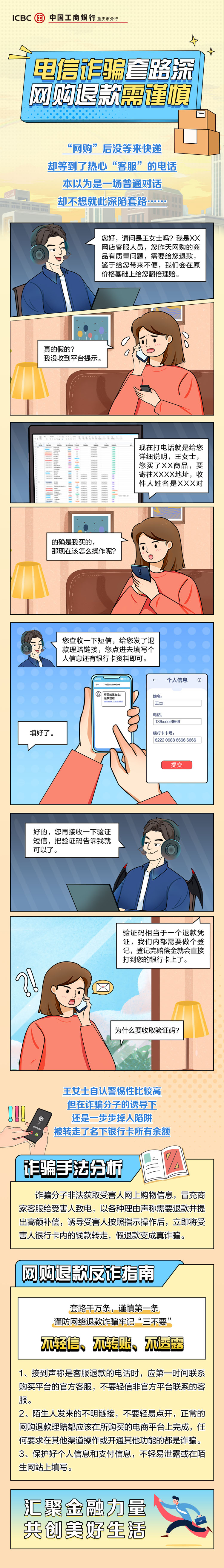 “網(wǎng)購(gòu)”后沒等來(lái)快遞,卻等到了熱心“客服”的電話;本以為是一場(chǎng)普通對(duì)話,卻不想就此深陷套路……工行重慶市分行提醒廣大消費(fèi)者:不輕信、不轉(zhuǎn)賬、不透露。接到聲稱客戶退款的電話時(shí),應(yīng)第一時(shí)間聯(lián)系購(gòu)買平臺(tái)的官方客服,不要輕信非官方平臺(tái)聯(lián)系的客服。陌生人發(fā)來(lái)的不明鏈接,不要輕易點(diǎn)開。保護(hù)好個(gè)人信息和支付信息,不輕易泄露或在陌生網(wǎng)站上填寫。(張睿)