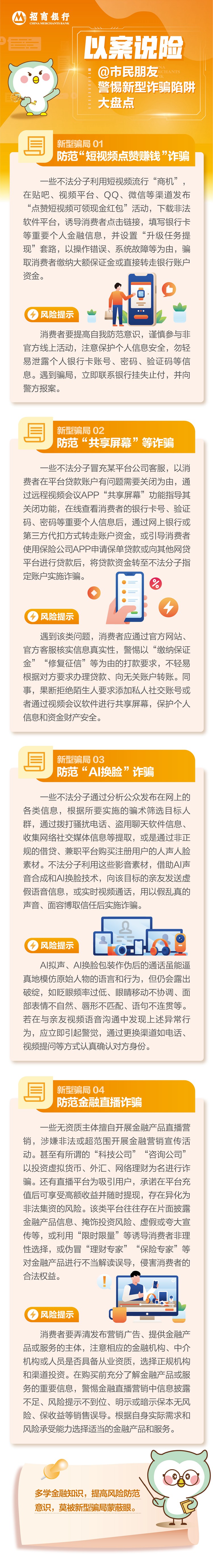 近期,“短視頻點贊賺錢”“共享屏幕”“AI換臉”“金融直播”等新型網(wǎng)絡詐騙多發(fā)頻發(fā),嚴重威脅到消費者財產(chǎn)安全。招商銀行重慶分行提醒廣大市民,多學習金融知識,提高風險防范意識,莫被新型騙局蒙蔽雙眼。(招商銀行重慶分行)