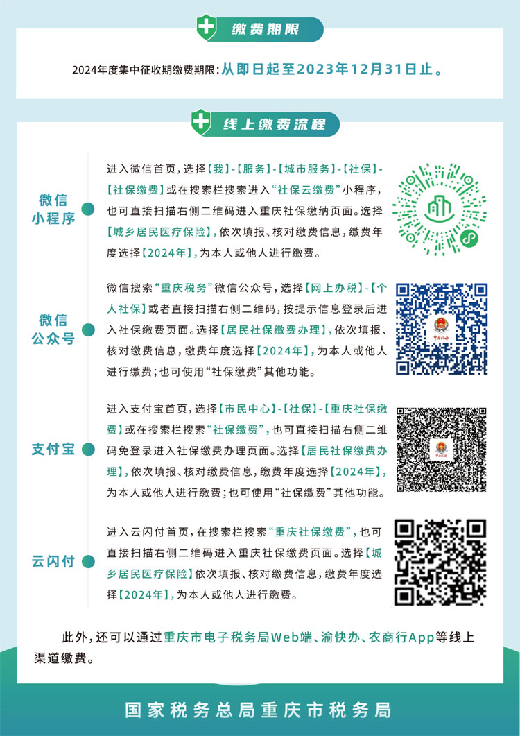 市民參保繳費(fèi)也很便捷。線上,可通過重慶市電子稅務(wù)局、“重慶稅務(wù)”微信公眾號、“社保云繳費(fèi)”微信小程序、渝快辦、支付寶、云閃付進(jìn)行參保繳費(fèi)。其中,“社保云繳費(fèi)”微信小程序和支付寶可免登錄直接進(jìn)行繳費(fèi)。線下,參保人可在戶籍所在地或居住地的社保所、居委會(村委會)以及辦稅服務(wù)廳辦理。