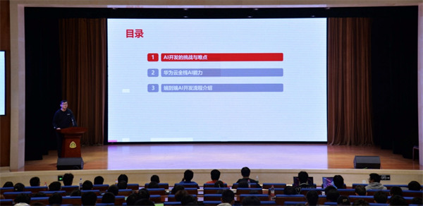 現(xiàn)場,華為云EI算法工程師劉宇展開“大模型時代機遇下,高校開發(fā)者如何學(xué)好AI”的主題演講,對人工智能的發(fā)展歷程以及人工智能入門難點,AI工程師面臨的問題和挑戰(zhàn)進行了普及,還針對華為云一站式AI開發(fā)管理平臺ModelArts和AI Gallery社區(qū)的多種功能進行講解,鼓勵學(xué)生們抓住時代機遇,學(xué)好AI。