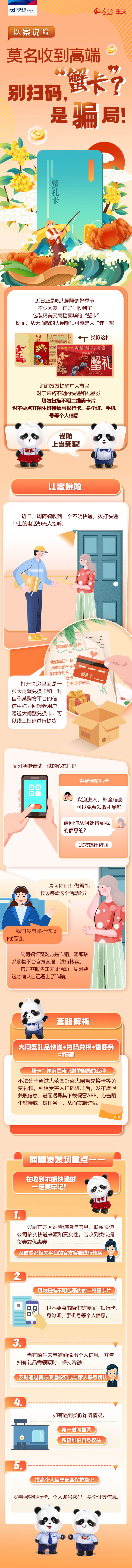 近日正是吃大閘蟹的季節(jié),不少市民“正好”收到了包裝精美又高檔豪華的“蟹卡”。然而,從天而降的大閘蟹很可能是大“詐”蟹,浦發(fā)銀行重慶分行提醒廣大市民,對于來路不明的快遞和禮品券,切勿掃描不明二維碼卡片,也不要點開陌生鏈接填寫銀行卡、身份證、手機號等個人信息,謹防上當受騙。(李金)