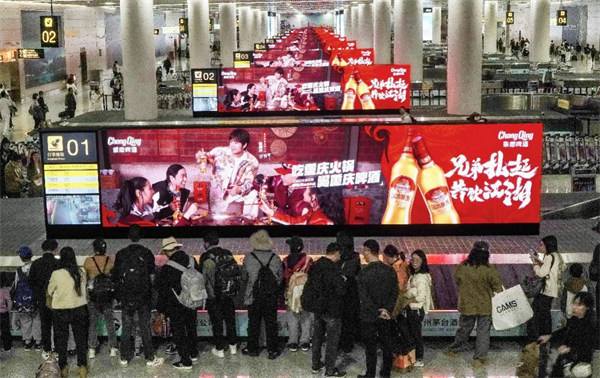 搶抓旅游復(fù)蘇契機,在中秋國慶假日期間,重慶啤酒旗下樂堡、重慶、烏蘇、西夏、風(fēng)花雪月品牌分別“包”下旅游熱點城市重慶、貴陽、烏魯木齊、庫爾勒、銀川、麗江、昆明、西雙版納和大理等機場到達大廳LED大屏。這些品牌與城市文化高度契合,成為了游客落地之后對這座城市的第一印象。