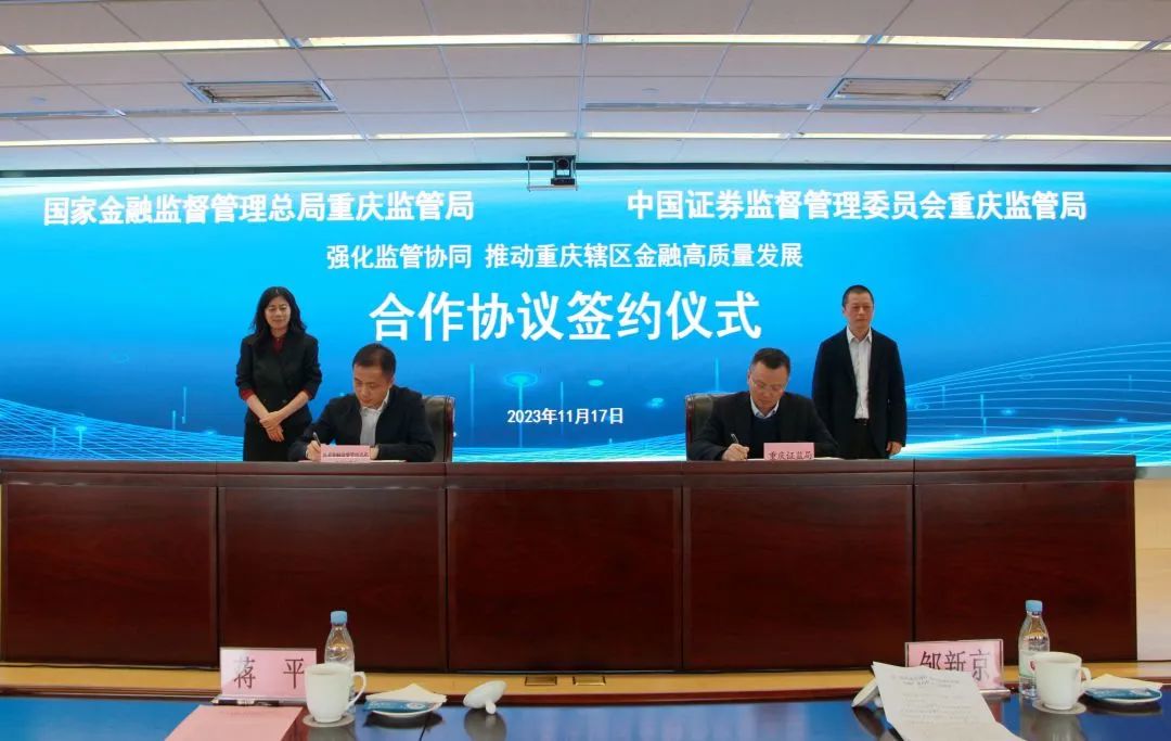 共同支持西部金融中心建設(shè)、共同推動企業(yè)上市培育、聯(lián)合打擊非法金融活動……17日,國家金融監(jiān)督管理總局重慶監(jiān)管局與中國證券監(jiān)督管理委員會重慶監(jiān)管局簽訂《強化監(jiān)管協(xié)同推動重慶轄區(qū)金融高質(zhì)量發(fā)展合作協(xié)議》(以下簡稱《合作協(xié)議》)。這是中央金融工作會議后,國家金融監(jiān)督管理總局和中國證券監(jiān)督管理委員會在省級派出機構(gòu)層面的首個合作簽約。