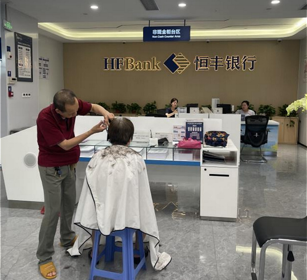 邀請理發(fā)師到網點免費為周邊老人理發(fā)。恒豐銀行重慶分行供圖