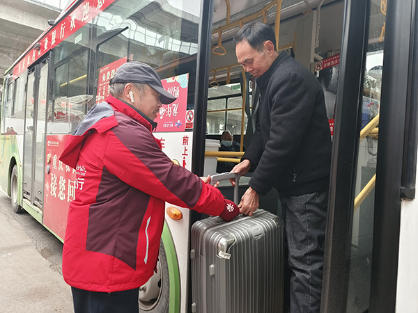 重慶農(nóng)商行云陽支行志愿者為務(wù)工返鄉(xiāng)人員安排轉(zhuǎn)運大巴、搬運行李。重慶農(nóng)商行供圖